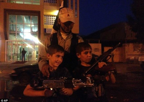 圖:極端武裝分子和兩個孩子在一起觀看ISIS在摩蘇爾的遊行 英國《每日郵報》