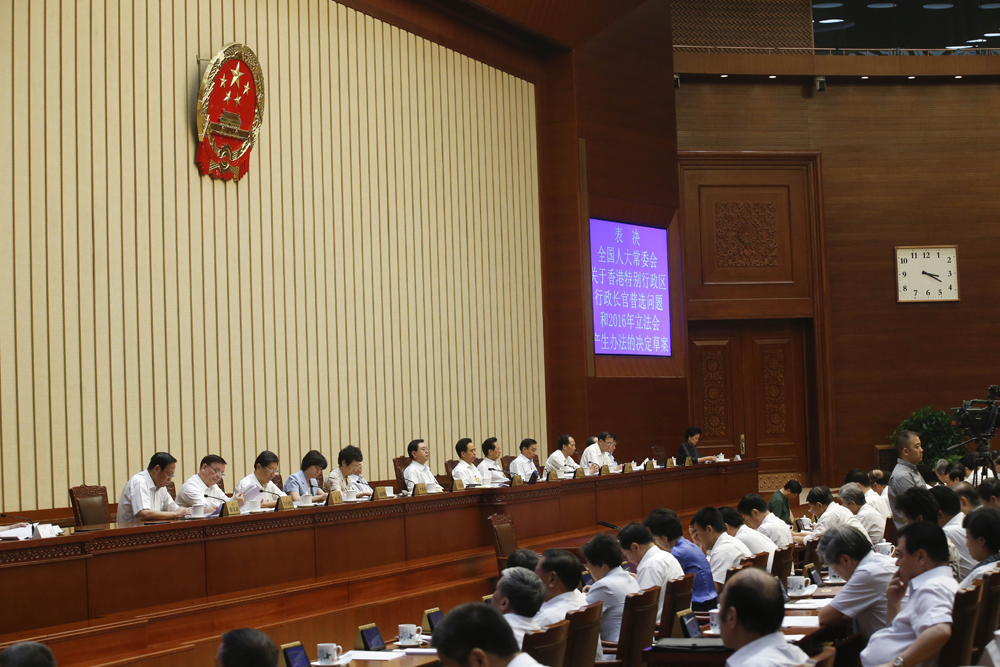 圖:全國人大常委會會議昨日以170票,全票表決通過關於香港特別行政區行政長官普選問題和2016年立法會產生辦法的決定 中新社