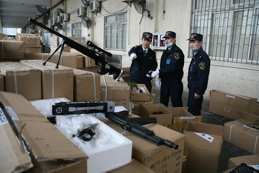 圖:由於仿真槍玩家不斷增多,「市場需求」劇增,槍彈交易市場「供不應求」,仿真槍走私日漸增多。圖為深圳海軍繳獲的走私仿真槍