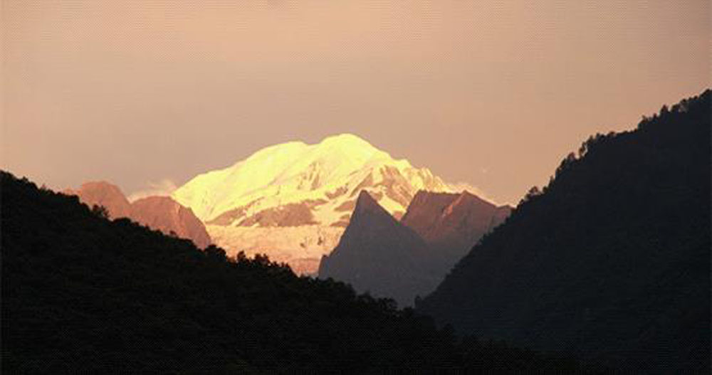 住下來的第二天就有人介紹說這裡可以拍到「日照金山」的奇景。如果你運氣好的話。那人還給我指點江山般地告訴我應在哪個角度朝?哪個方向。我自然不願放棄這個千載難逢的好時機。於是每天早上嚴格按照那人的指示在六點半前後蹲守在別墅的某個角落。也許是經度的關係,這裡的早晨天亮的比較晚,不像江南五點多就天光大亮了。也必須要到六點出點頭才看得見微曦。三天的守候終於有了真誠的回報,我拍到了「日照金山」的全貌。也就是我回來後按捺不住迫不急待先發的那張照片: