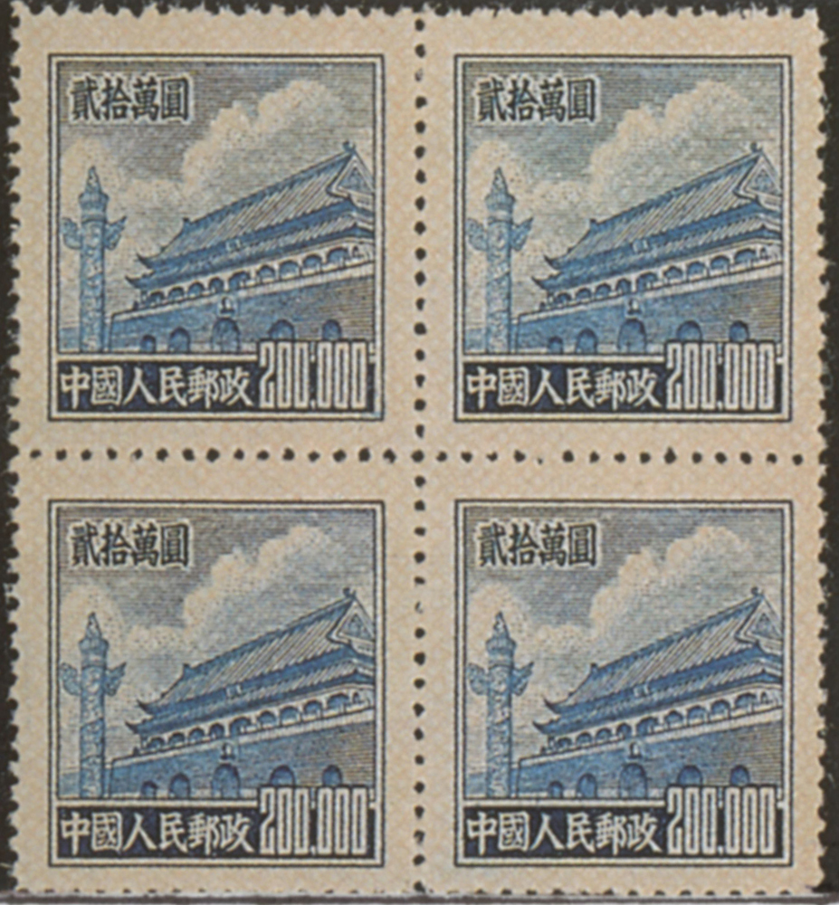 談到上世紀五十年代初的《天安門》郵票,較珍罕和價值高者,應數一九五一年四月發行的第五版(雕刻版),十四齒,面值至二十萬圓。高面值的二十萬圓與拾萬圓者最少。更罕有就是二者的八方連(帶邊)和四方連。附圖就是刷藍色的二十萬圓四方連,為沒有蓋銷的新票;近十年升值驚人。曾見另一同樣四方連,卻刷深藍色,價值相若。