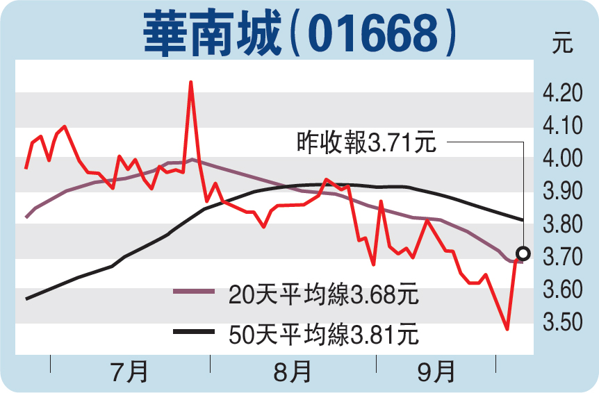 估值方面,以9月25日華南城的收市價3.71元計算,市盈率(P/E)和市帳率(P/B)分別為6.74倍和1.28倍。自一月份騰訊宣布入股以來,集團股價穩定在3-5元的區間上下波動。目前集團股價處於區間偏低位置,建議買入價3.5元,目標價5.0元,止蝕價2.9元。