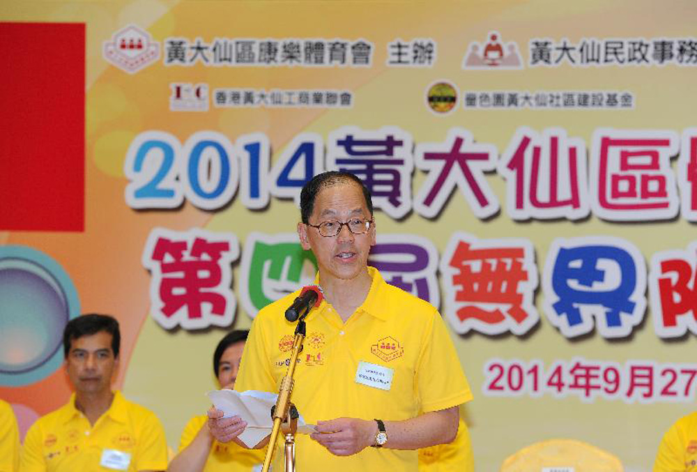 圖:民政事務局局長曾德成出席「2014黃大仙區體育節」閉幕禮暨第四屆無界限運動同樂日,以示支持社區康體活動。圖示曾德成在典禮上致辭
