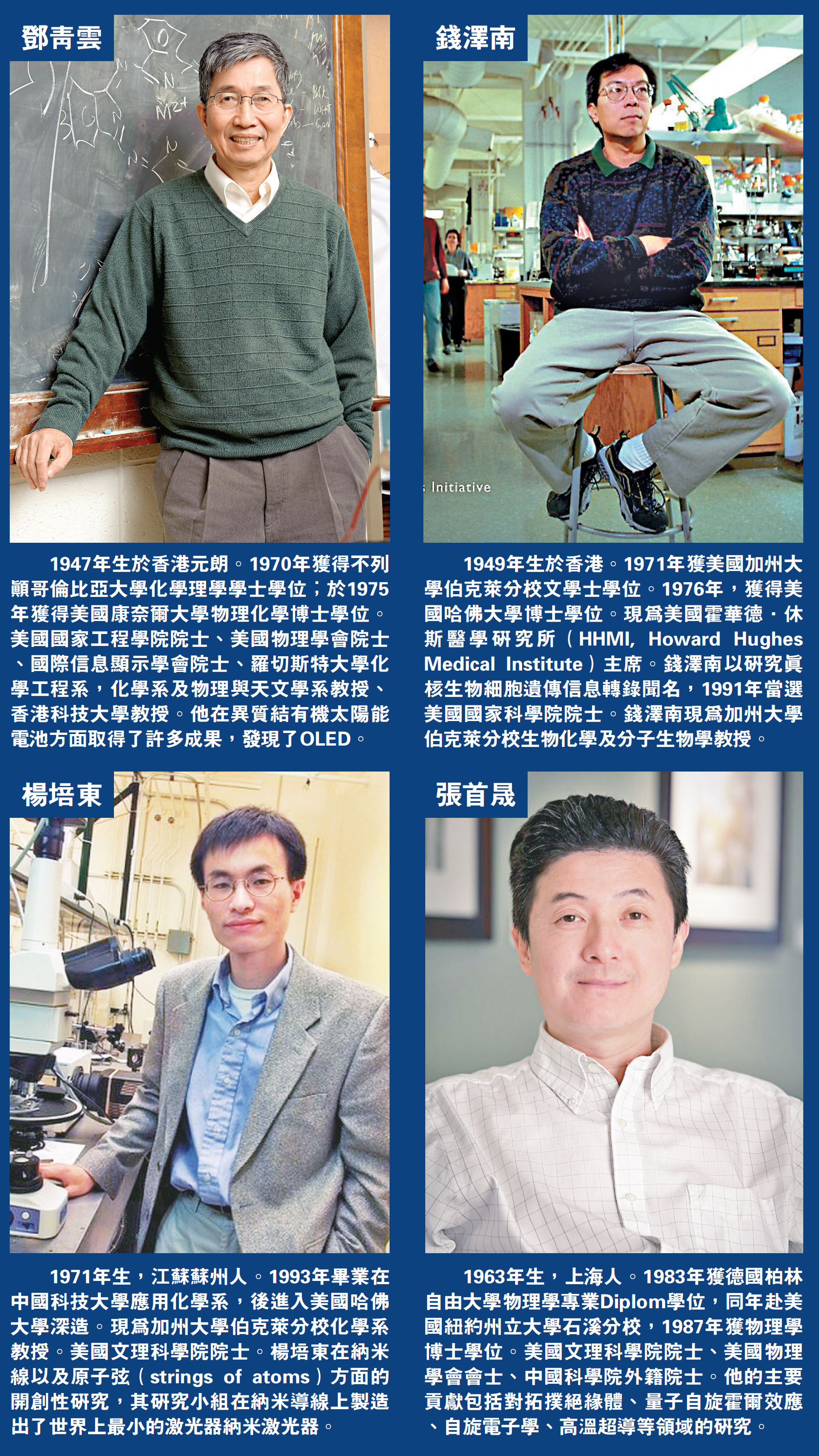 美籍華人科學家楊培東是進入名單的4名華人學者之一,現在加州大學伯克萊分校任教。他的入選原因是對納米光子學的貢獻,包括研製出第一個納米導線激光器。楊培東祖籍江蘇,1993年從中國科技大學畢業後赴美留學。1999年,年僅28歲的他便成為加州大學伯克萊分校助理教授,5年後被聘為終身教授。