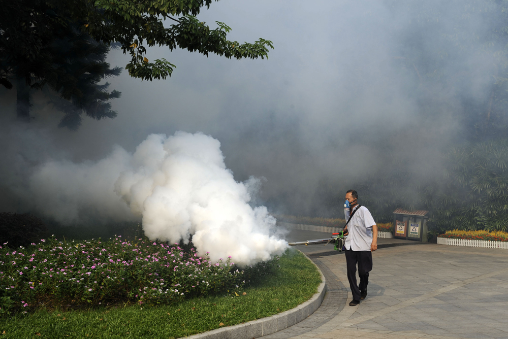 圖:為防控登革熱,廣州、佛山和中山等疫情高發區近期多次進行統一滅蚊行動。圖為防疫人員噴灑滅蚊藥物 大公報記者官文清攝