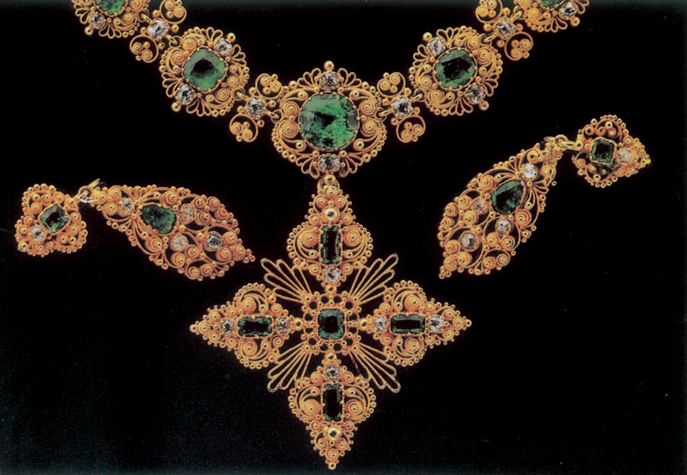 附圖為十九世紀時期歐洲人鑲製的套裝金頸飾及金耳環,十分罕有;不但工藝精美、設計典雅、華而不俗,而且所嵌之「祖母綠」(俗稱綠寶石),乃屬質素最佳的「西伯利亞綠寶」,色澤最美麗鮮亮,較優質的「哥倫比亞祖母綠」更難有完美者。故這套金飾價值,不光是無甚瑕疵的骨董,更非所用之黃金與陪襯之微型珍珠;主角應為所鑲嵌的幾顆上品「祖母綠」。