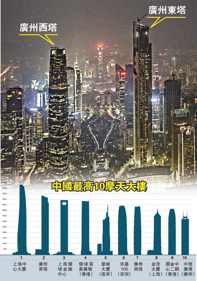 □廣州周大福金融中心(廣州東塔)今日封頂,以530米高度刷新了穗第一高樓紀錄。這座由香港財團鄭裕彤家族投資的大樓總價逾百億元人民幣,未來將集辦公、娛樂、酒店、商場等綜合項目,擬於2016年投入使用。目前,鄭氏家族旗下的K11、瑰麗酒店已確認入駐,搶灘廣州高端消費產業。 【大公報記者董謙君廣州二十八日電】