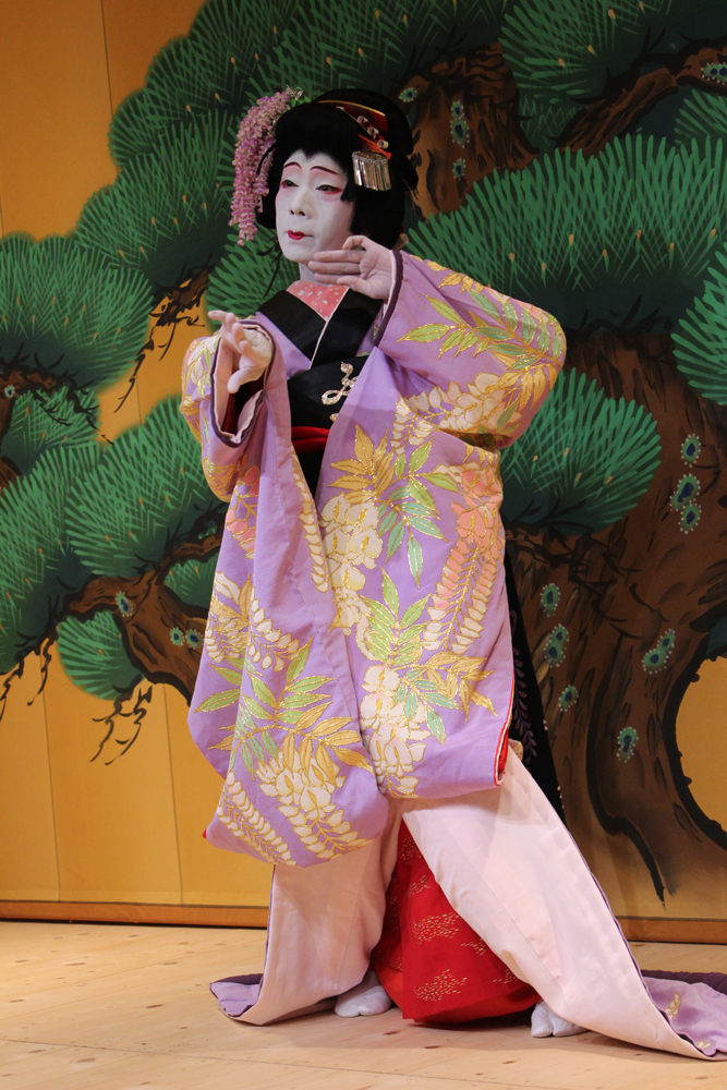此次,中村表演的劇目為《籐娘》,因此服飾和頭飾均以籐花為主。厚重的假髮、振袖和服、黑色長腰帶,背部上還有刺繡精細的長垂帶,整體造型華麗而優美。完成上台前所有的準備工作,快則也要1個多小時。