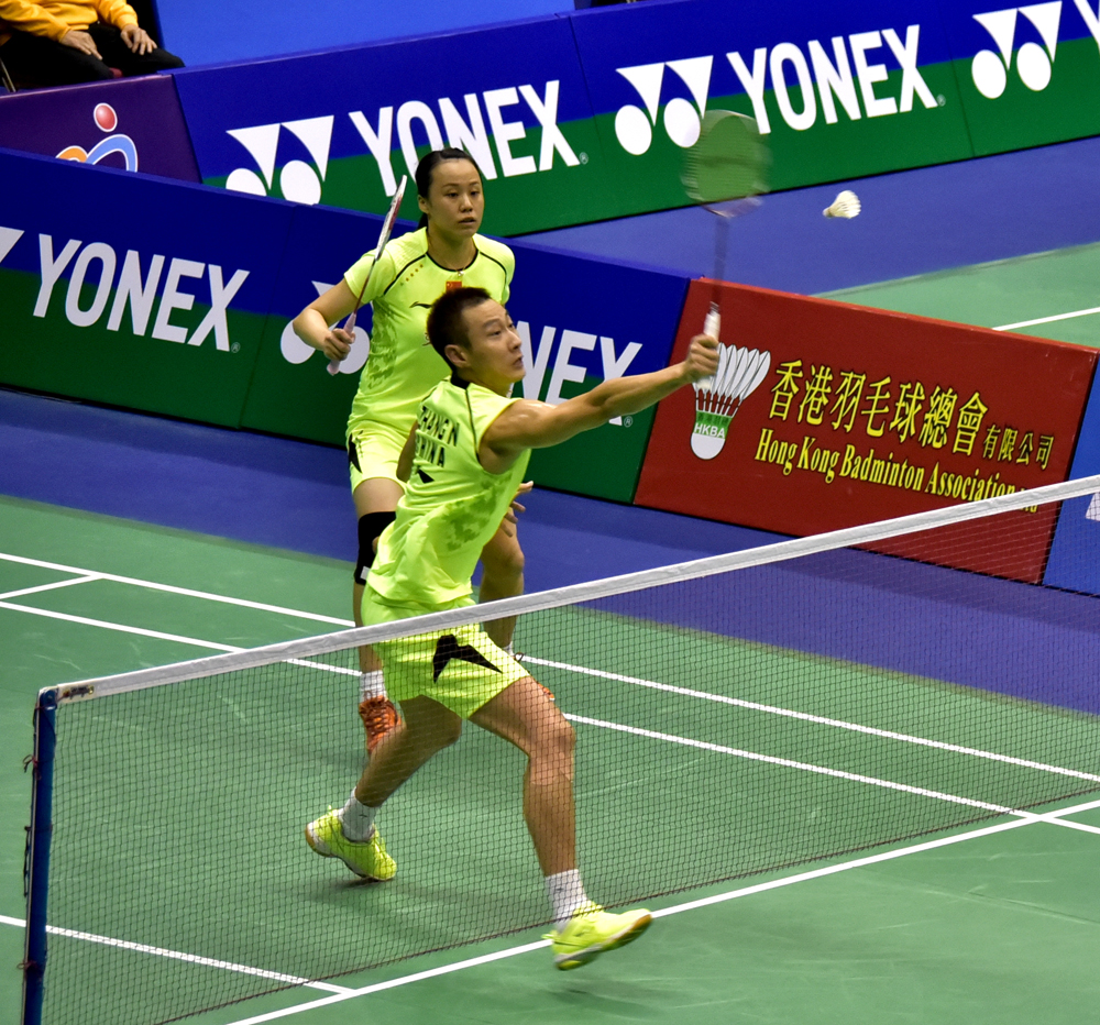 圖:中國混雙組合張楠(前)正在回球,後為隊友趙芸蕾     本報攝