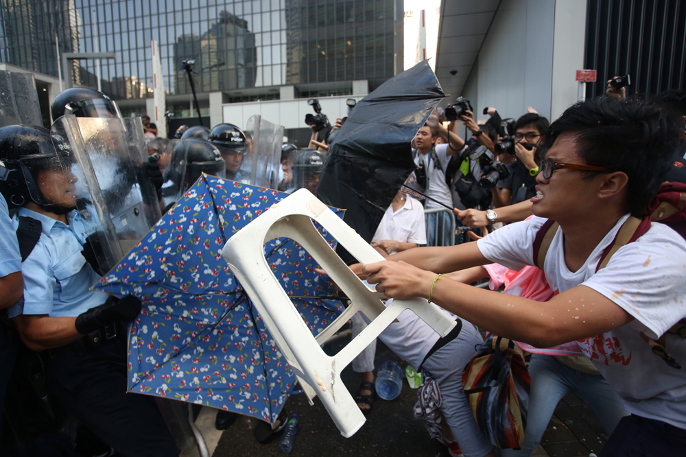 11月19日的凌晨,大約兩百名暴徒,衝擊了立法會大樓的玻璃門。立法會的十多個反對派議員,六個小時以後,迅速舉行記者招待會,譴責了這些暴力行為,蓄意和有關的派別進行了切割。議員直斥「有人生事破壞佔領運動,令親痛仇快」;「暴力行動與雨傘運動一直強調的愛與和平、非暴力精神及原則背道而馳,對雨傘運動產生負面影響」。