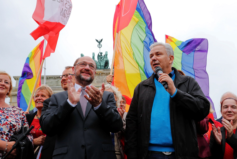 圖:德國社會民主黨黨魁舒爾茨(左)6月30日在柏林慶祝同性婚姻法案通過 路透社