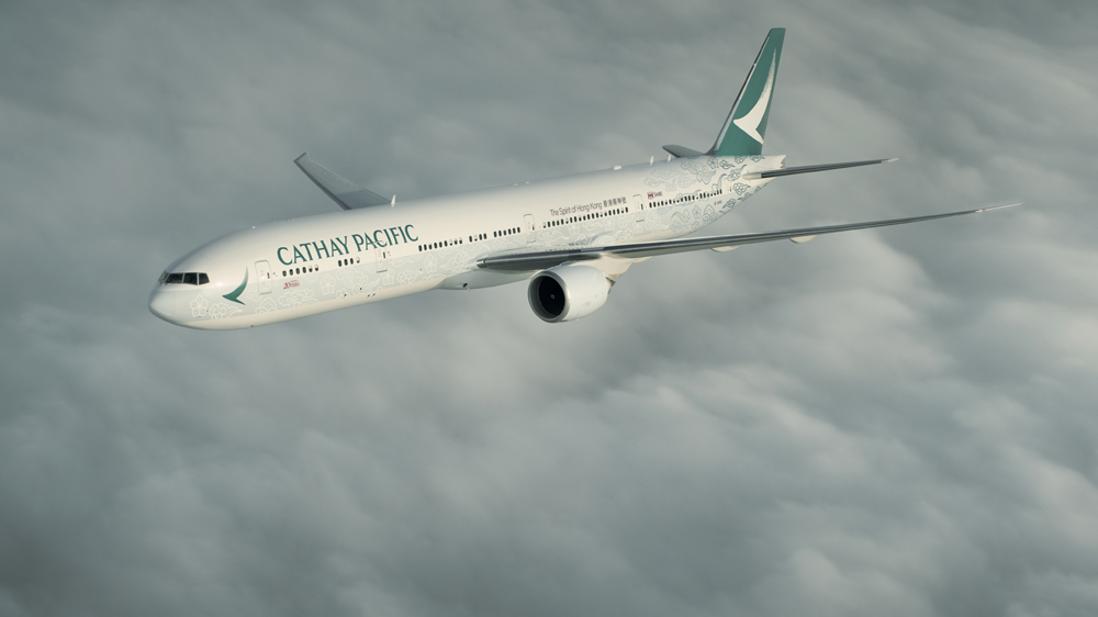 圖:為慶祝香港回歸20周年,國泰以傳統的雲彩和洋紫荊花為題材,創造新一代「香港精神號」