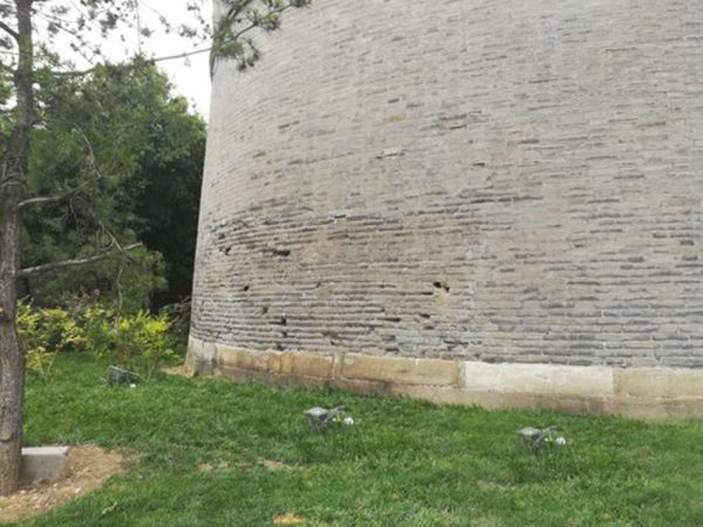 圖:宛平城牆上的坑孔清晰如故。一位老人說,這就是當年「七七事變」日軍炮擊宛平城留下的彈孔\中新網