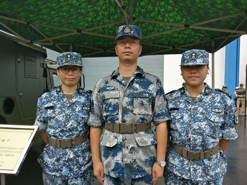 石崗軍營內,一班參加過「香港大學生軍事生活體驗營」的大學生在現場協助軍人,包括派發相應物資、提供展示區導向等輔助工作。公開大學三年級生張同學(圖左)對在石崗軍營協助軍人感到開心,更感受到許多市民前來參觀的興奮心情,感受軍人備受市民愛戴。