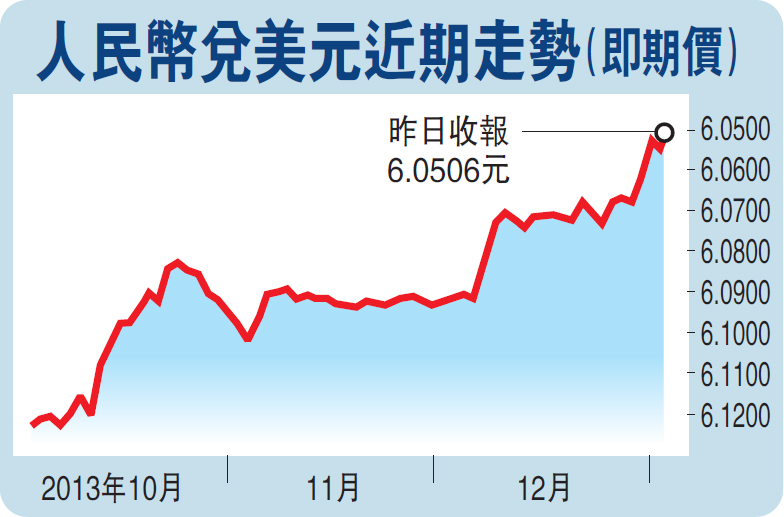 人民幣匯率兌美元加速升值,加快投機性的熱錢湧入。數據顯示,去年全年人民幣兌美元中間價升值幅度達到3.1%,即期匯價的升幅為2.91%。踏入2014年,人民幣兌美元升勢持續,昨日人民幣兌美元中間價雖回落21個基點報6.0990元,但無礙即期匯價上升,盤中一度觸及6.0500元的歷史高位,最後收創6.0506元,較上日收盤價走高33個基點,盤中及收盤價同創紀錄高位。