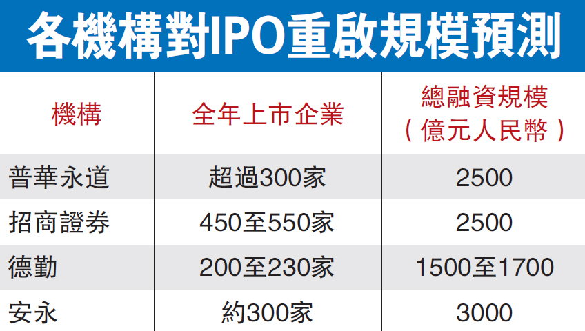 有關IPO重啟對A股的影響,普華永道中國審計部合夥人孫進昨日表示,當前已提交申請等待IPO的700多家企業中有相當一部分經受了前期市場的考驗,新股發行重啟將為這些公司的發展迎來良好的開端。據該行預測,今年IPO數量有望接近歷史最高水平,超過300宗,融資規模可達2500億元。