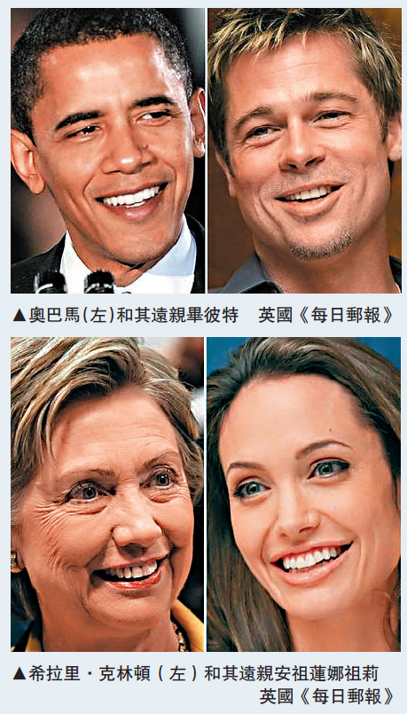 【本報訊】據英國《每日郵報》消息:新英格蘭歷史族譜協會的研究者發現美國總統奧巴馬是演員畢彼得的遠房表兄,而希拉里則是畢彼得女友安祖蓮娜祖莉的親戚。