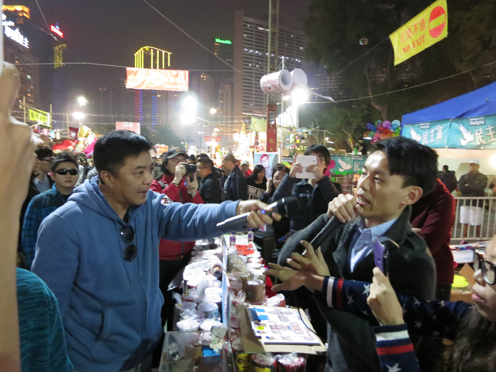 圖:1月26日「蘭花系」主席馬健賢(左)帶?約30名黨徒,用無線咪指嚇民主黨成員並破口大罵