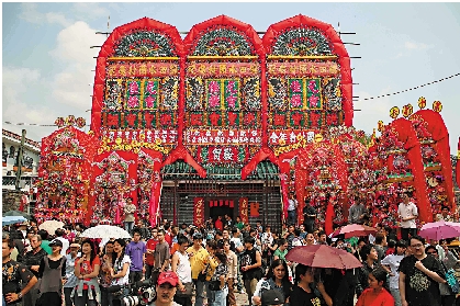 圖:在元宵節,錦田洪聖宮前迫滿村民和花炮