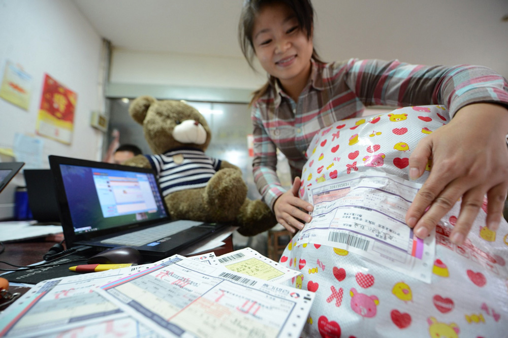 圖:揚州一淘寶商家在黏貼快遞單 新華社