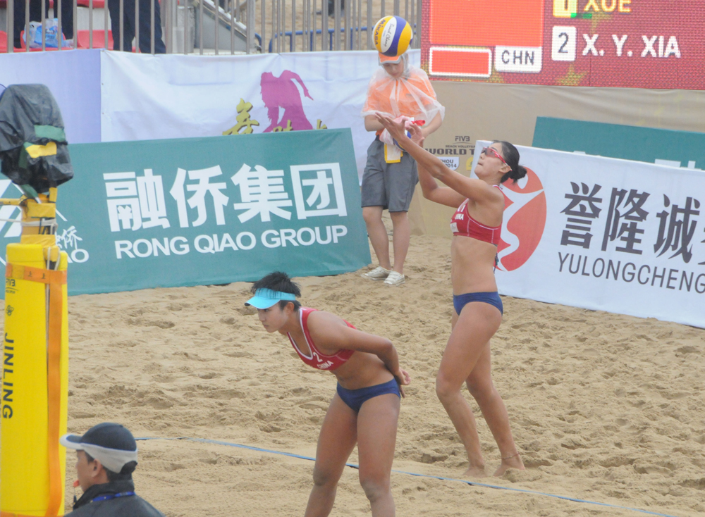 【大公報記者史兵福州二十六日電】2014年國際排聯世界沙灘排球巡迴賽「融僑杯」福州公開賽,今天進行的女子組比賽,中國薛晨╱夏欣怡組合先後戰勝泰國尤杜╱查維組合和二號種子巴西塔麗塔╱麗瑪組合進入4強。中國女子組另一對選手王凡╱岳園在戰勝德國選手進入8強後,負於美國三屆奧運冠軍選手沃爾什╱羅斯止步4強。明天上午10時,薛晨╱夏欣怡將在準決賽對美國選手沃爾什╱羅斯,如果獲勝將在下午爭奪冠軍。