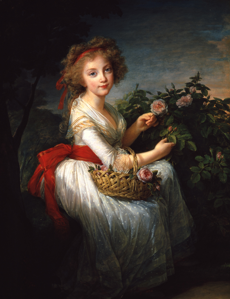 法國女畫家伊麗莎白·維熱─勒布倫被認為是歷史上最傑出的肖像畫家之一,《波旁的瑪麗亞·克里斯蒂娜公主肖像》繪製於一七九○年。瑪麗亞·克里斯蒂娜是撒丁國王埃馬努埃萊一世最小的女兒,成年後嫁給西西里王國第三任國王費迪南多二世為妻。繪製這幅肖像時小姑娘只有十一歲,畫中的她坐在花園的岩石上,正把採到的鮮花放在一個筐裡。