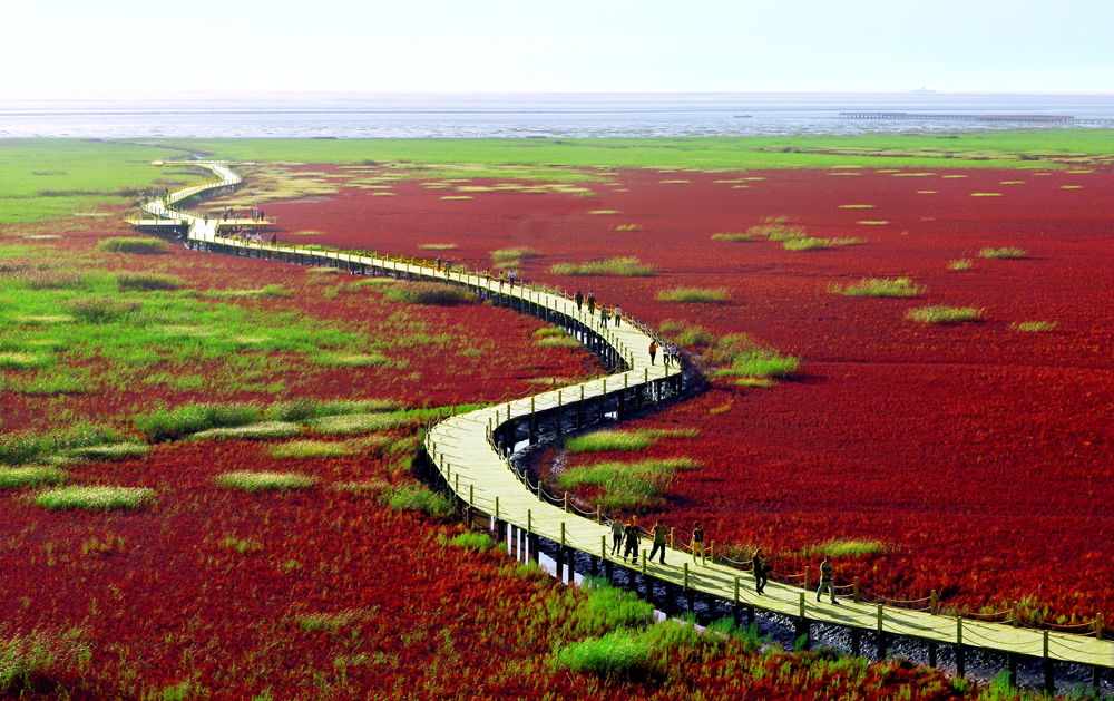 【大公報訊】在遼寧省盤錦市大窪縣,有一片綿延百里的淺海灘塗,她嫣紅似火,如半落的晚霞燃燒在水天之間;她妖嬈嫵媚,轉身間衣帶飄飄染紅了無限蒼穹……她就是紅海灘,一處以火與紅為全部生命的地球飄帶。