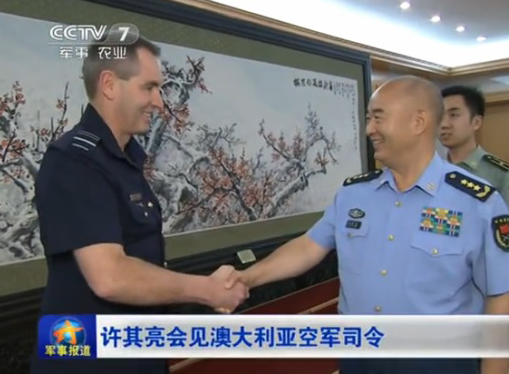 圖:中央軍委副主席許其亮十七日會見來訪的澳洲空軍司令布朗 央視畫面