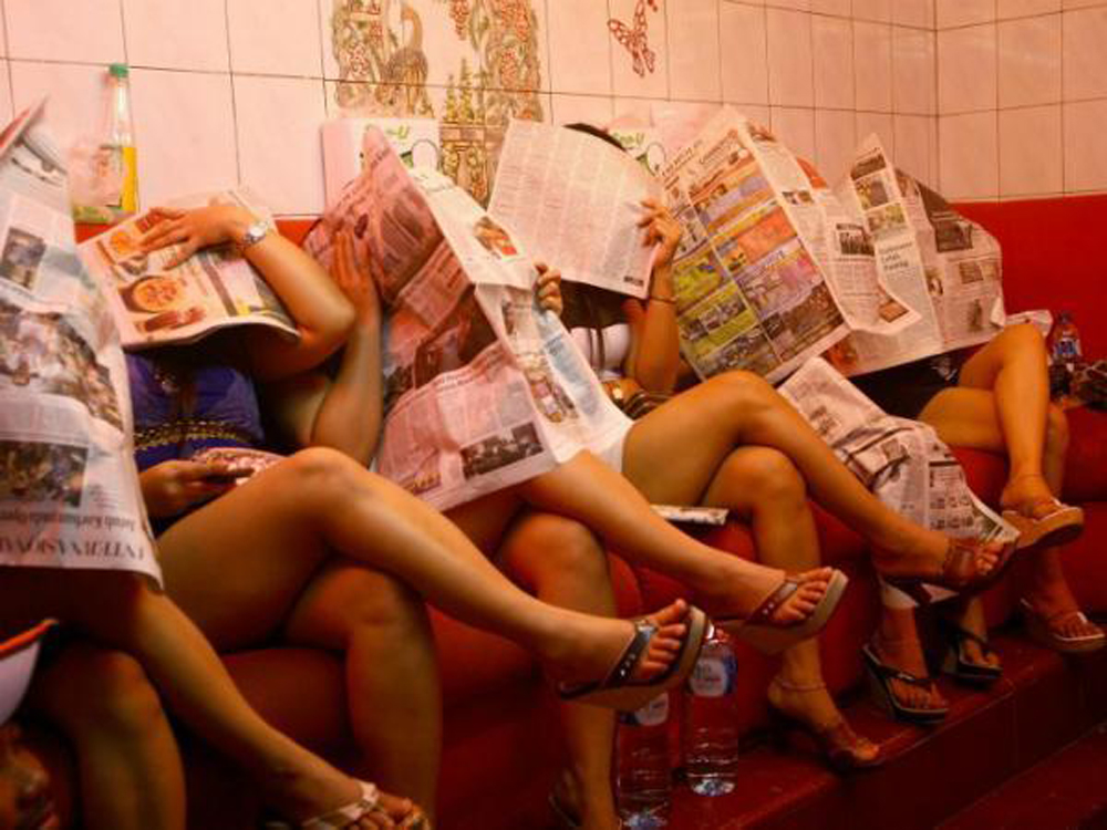 圖:紅燈區多莉的性工作者們被警察突襲掃黃時用報紙擋住面部 《雅加達郵報》