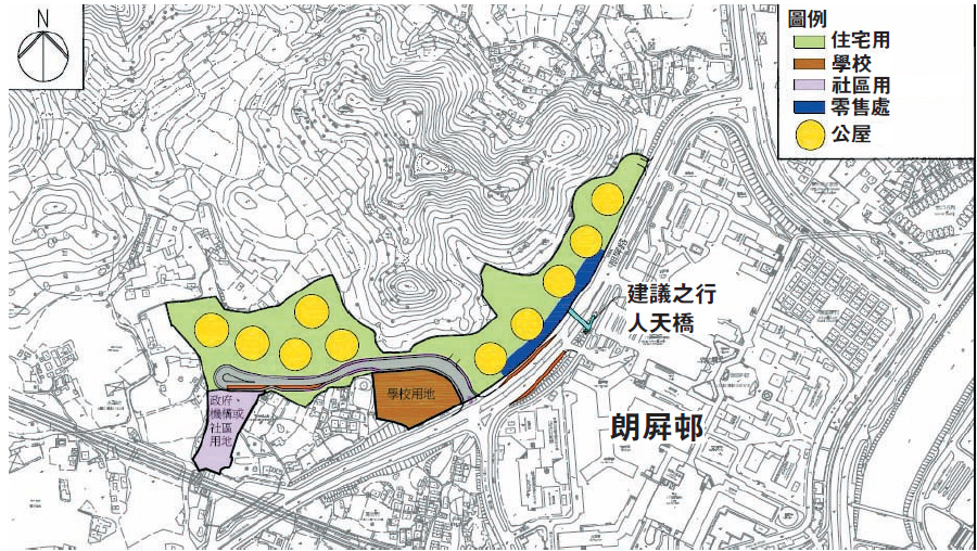 政府未來5年將改劃152幅土地作房屋用途,改劃14幅用地、提供4.2萬個單位的元朗是「供屋重區」。規劃署建議,將位於朗屏?以北、髻山與朗屏路之間,面積約5.6公頃的山邊土地,由「綠化地帶」改劃為「綜合發展區(1)」,作公營房屋、學校及社區設施等用途,以最高6倍地積比率發展,可興建不高於主水平基準135米的樓宇。