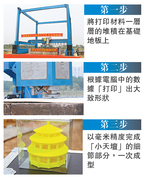 在19日召開的「2014世界3D打印技術產業大會暨世界3D打印技術博覽會」上,一家名為「尤尼科技」的青島企業宣布將於6個月後在青島打印出一座7米見方的仿天壇古典建築。這是由其自主研發的世界最大3D建築打印機在青島高新區雕塑園的首次打印任務。