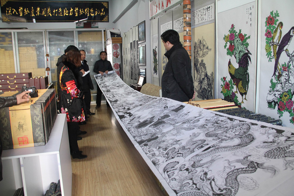 其中具代表性的,是任景權經營的海倫市景泉手工剪紙工藝品廣場。在他店舖裡,記者看到已將剪紙包裝在各種各樣的工藝品盒中,裝裱成卷軸。形式種類繁多,包括花鳥、山水和人物等。為他製作剪紙圖案的,不僅有海倫本地人,還有南方來的,他們多是工筆國畫高手。