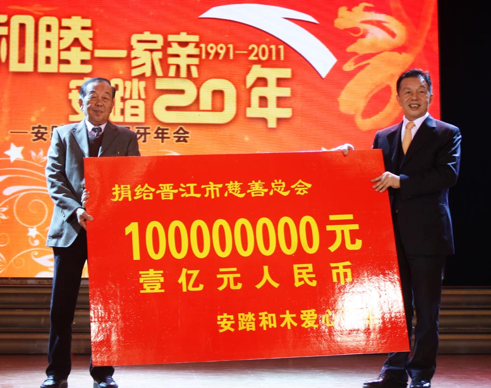 1月9日晚,中國著名體育用品品牌──安踏集團舉行尾禡晚宴,安踏榮譽董事長丁和木將1億元這筆巨額善款捐給了晉江市慈善總會,並在晉江市慈善總會設立「安踏和木愛心基金」。