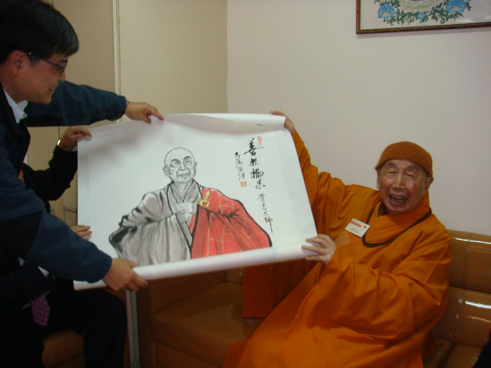 圖:香港佛教聯合會會長覺光大和尚喜接善信給他的畫像\本報攝