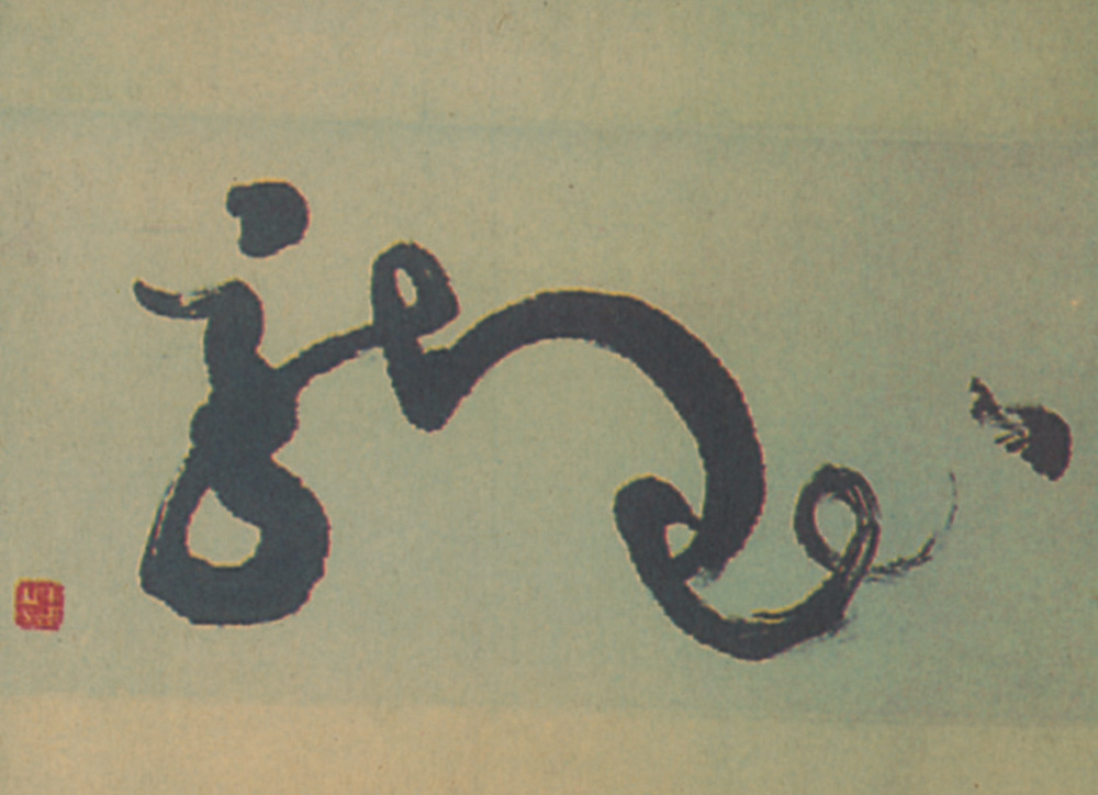 附圖的「龍」字,名副其實筆走龍蛇;乃近代名家李果青專為龍年所書。其草書另創一格,使筆者想到唐代兩大草書聖手張旭與懷素(字藏真)。張旭也曾書狂草「龍」字,簡練浪漫,如飛龍在天,大氣磅礴;一筆連綿,一氣呵成,筆法高妙。懷素的「龍」字亦為狂草,純以中鋒運行,形態簡化,線條奔逸,氣勢非凡。二者「龍」字狂草最大不同之處在收筆。張旭向下彎屈如蛇身蜿蜒,似巨龍擺尾。懷素則最後突旋轉向上,龍尾像倒鈎鐮刀,筆力貫注,挺拔有勢。附圖李果青的「龍」字,基本上是源於兩位草聖之草法;但「龍」字收筆卻大異其趣,蛻變成虬卷翻騰的筆勢;好比一幅減筆畫,展現龍身顯著拉長與轉曲的形態,富有動感。正如古代玉龍造型的演變,由商、周的「C」龍,衍化為戰國虬曲有致的「S」龍。