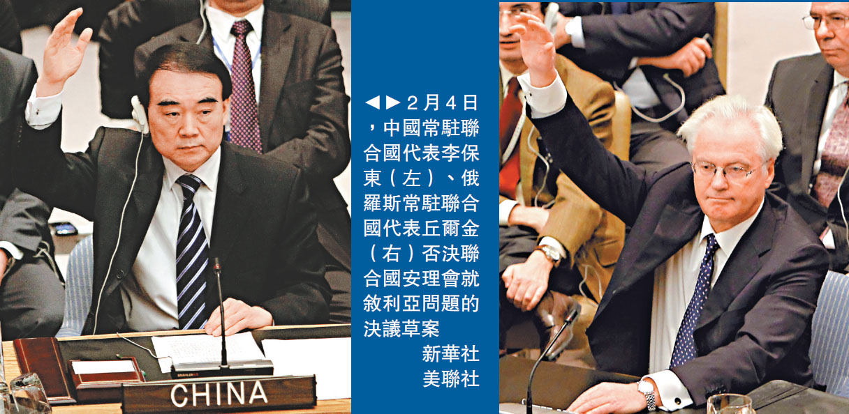 圖:2月4日,中國常駐聯合國代表李保東(左)、俄羅斯常駐聯合國代表丘爾金(右)否決聯合國安理會就敘利亞問題的決議草案/新華社 美聯社