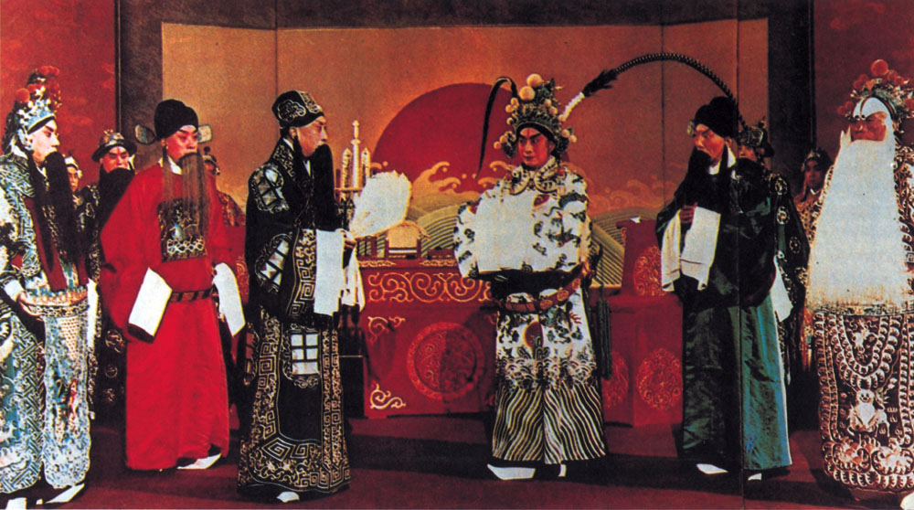 圖:《群英會》劇照。馬崇仁(左起)飾甘寧、馬盛龍飾闞澤、馬連良飾諸葛亮、葉盛蘭飾周瑜、譚富英飾魯肅、裘盛戎飾黃蓋/資料圖片
