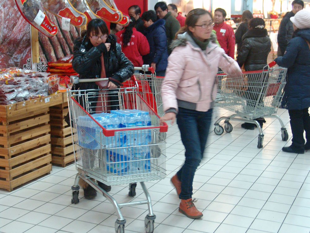 圖:江蘇鎮江市市民日前在超市搶購瓶裝水/新華社