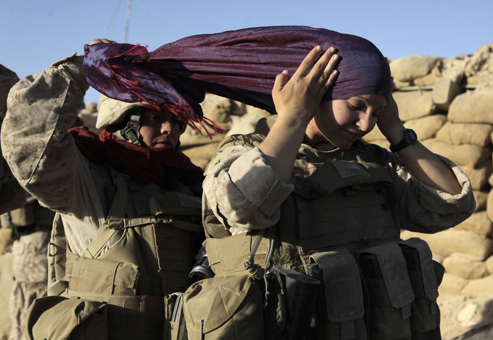 圖:2009年8月10日,在阿富汗,一名美軍女兵在同袍的幫助下紮頭巾/資料圖片