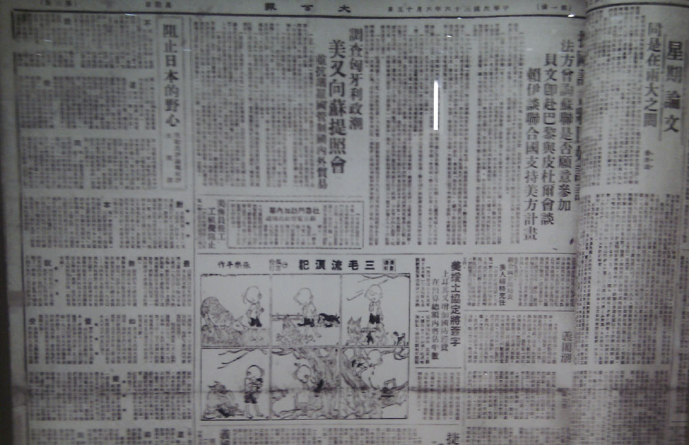 1947年6月15日,《大公報》在其第三版上連載張樂平的最新創作《三毛流浪記》,該系列作品從三毛的視角揭露當時社會「朱門酒肉臭,路有凍死骨」的現實,甫一登場即在全國引發震動,《大公報》當年同時擁有滬版、津版、渝版、港版,三毛很快便風靡全國,並從此被海外華人華僑所熟知喜愛。張朵朵說,宋慶齡在閱讀過《大公報》連載的《三毛流浪記》後非常感動,她特意在上海「燕雲樓」款待張樂平和《大公報》的副刊編輯,宋在席間更激動地對張樂平說「你為流浪兒做了件大好事」,並倡辦「三毛樂園」以幫助貧苦兒童。