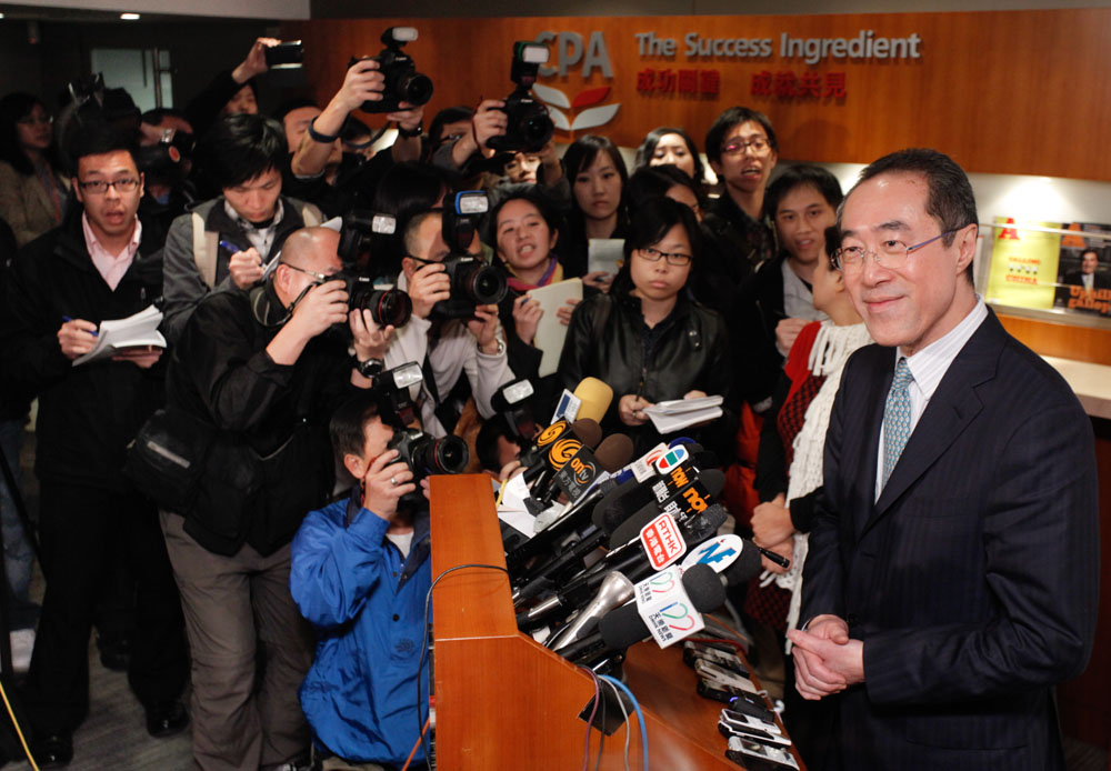 圖:捲入僭建風波的唐英年,昨晚出席一場論壇時成為傳媒追訪的焦點/本報記者林雨燊攝