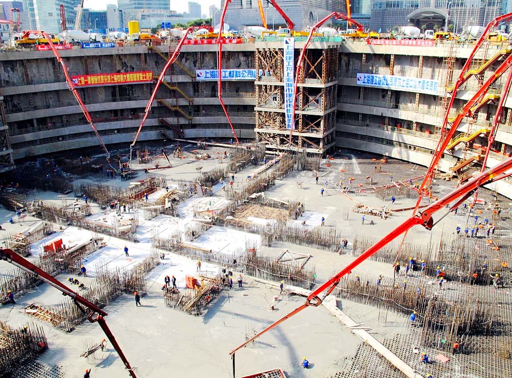據了解,上海中心大廈主樓深基坑的大底板,是一塊直徑121米、厚6米的圓形鋼筋混凝土平台,位於深31.4米、局部深34.4米的深基坑底部,同其下方的955根主樓樁基合力承載起121層主樓的負載。已於2011年12月28日完成的地下部分開挖總面積達2.2萬平方米,相當於3.2個足球場。