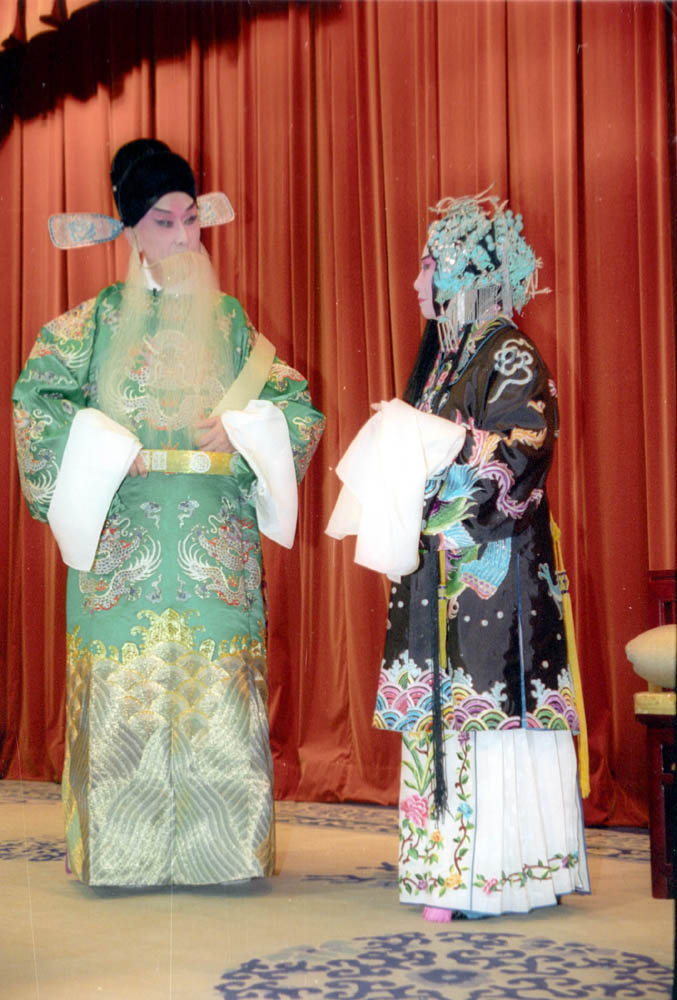 圖:辜振甫(左)和夫人辜嚴倬雲(右)在1994年12月綵排京劇「二進宮」等戲碼資料圖片