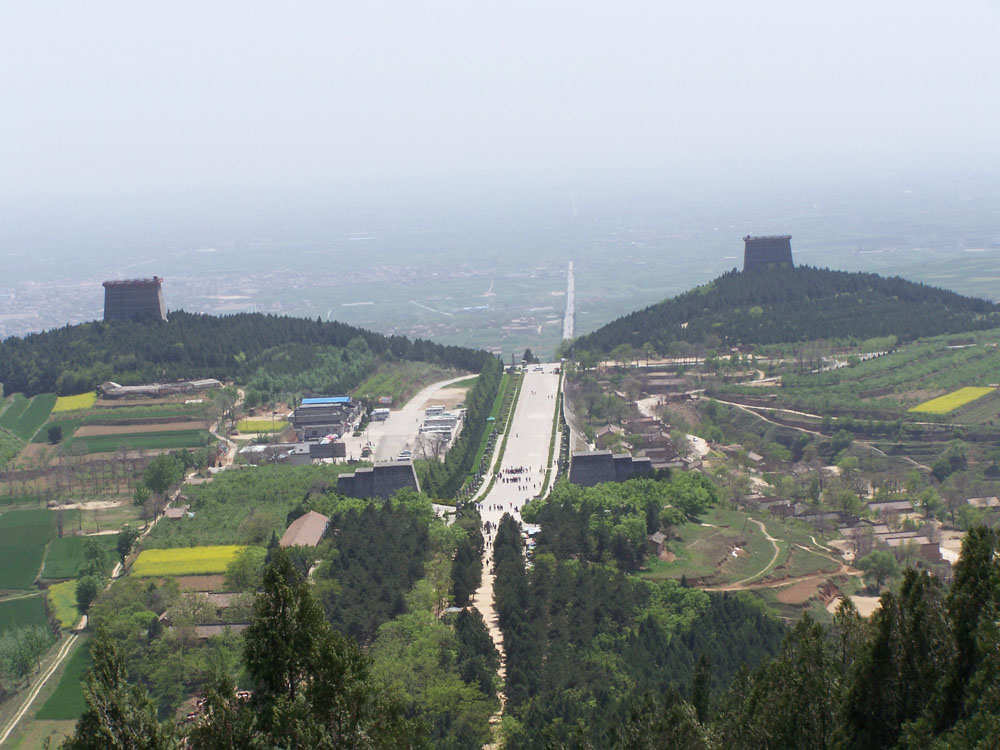 從古城西安向西北方向行約80公里,來到乾縣唐僖宗靖陵往西眺望,位於梁山上的乾陵宛若一位婦人悠閒肅穆地仰面躺臥在那裡:主峰像她的頭顱,峰頂上的樹林成了她飄逸的秀髮,司馬道是她的玉頸,南面的兩個突兀的土闕恰似婦人的雙乳,舒展的雙腿伸向廣袤無垠的平川,可謂惟妙惟肖,活靈活觀。