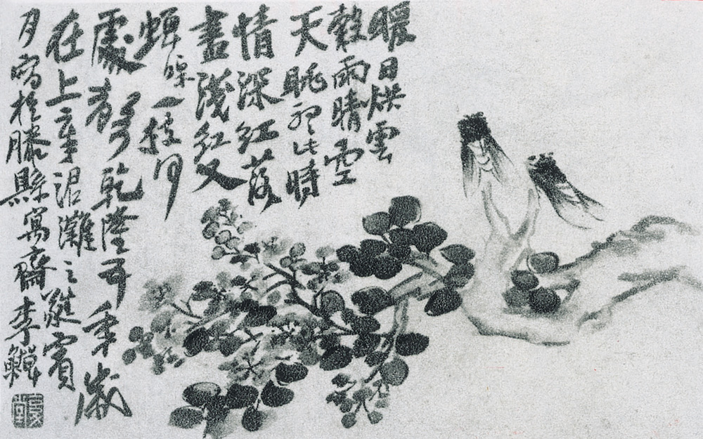 「揚州八怪」中,鄭板橋畫蘭、竹,金農(金冬心)、汪士慎和羅聘等畫梅花,皆筆情縱逸,隨意揮灑,各有風格,脫盡時習;真跡均十分值得收藏。若論所畫花卉種類之多,首推李鱓。無論八仙花(似綉球花)、蘭花、牡丹、浮蓮、紫蝶花、石榴花、碧桃花、秋菊、臘梅、水仙、立荷和木芙蓉等,均各展妍姿;有些以昆蟲與小鳥點綴,相得益彰。像附圖就是他花卉圖冊中之一幀,於乾隆五年穀雨晴空時,用大寫意筆法寫花卉,破筆潑墨,酣暢淋漓,濃淡有致;以二蟬配襯,更覺雅韻雋逸。難怪張庚評他的花鳥畫,謂「縱橫馳騁,不拘繩墨,而多得天趣」。他用筆粗壯,豪爽奔放;構圖獨特,境界超妙。他的寫意手法,使人想起明代林良、徐文長(徐渭)、陳淳及清初石濤;而李鱓能不斷變化,自爾成局。