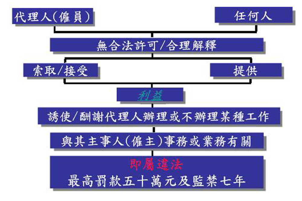 最近常常說到的「利益衝突」,是指當員工的「私人利益」與其職權出現衝突;利益可指任何有價值的東西,例如金錢、饋贈、佣金、職位、服務或優待等,但不包括款待(即供應在當場即時享用的食物或飲品)。比方說:一名正獲公司考慮的應徵者,是負責招聘的職員的親屬;一個公司考慮聘用的供應商,是由該公司採購職員的親屬或友人開設等。即使雙方只是口頭上達成了有關協議並沒有或未進行實際交易,其實都是違法。若被發現或檢舉,有關人士是觸犯《防止賄賂條例》第9條(見右圖),最高刑罰為入獄7年及罰款港幣50萬元。