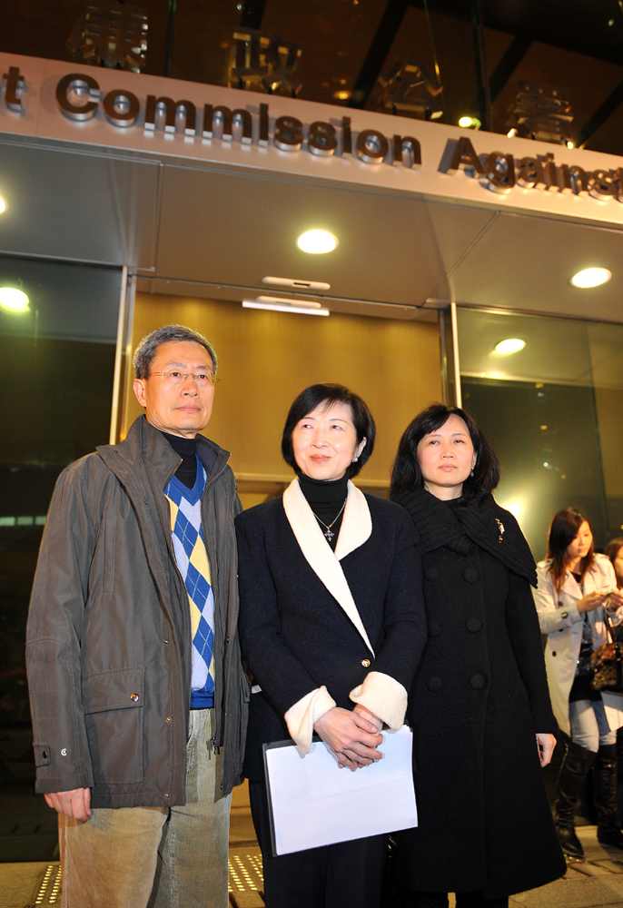 圖:梁振英競選辦人員昨晚以證人身份,主動到廉政公署及灣仔警署為事件提供資料。圖左起劉炳章、羅范椒芬、鄧淑德/本報記者林良堅攝