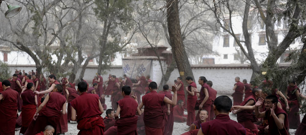 圖:色拉寺是藏傳佛教格魯派六大寺之一,每周一至六下午都會舉辦辯經活動。圖為僧人們在辯經過程中,唇槍舌劍,言詞激烈,並借助手勢來增強辯論力度新華社