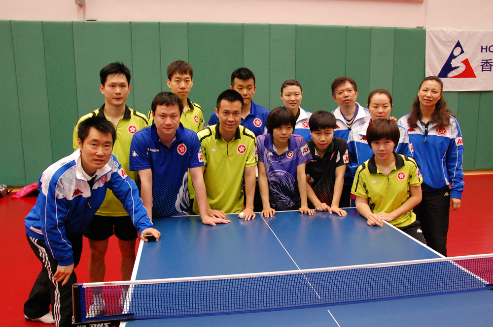 圖:港乒總教練惠鈞(後排右三)、男隊教練陳江華(前排左一)、女隊教練李惠芬(後排右一),與隊員合照\本報攝