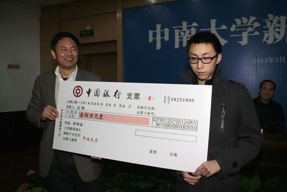 圖:20日,中南大學校長張堯學(左)為劉路頒發獎金100萬元\新華社